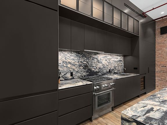 Entering the home, you are greeted with 11ft high ceilings and original details like refinished hardwood floors and exposed brick, while a stunning new kitchen and Lutron dimmable lighting system add modern convenience to this classic loft. This is the kitchen you've been dreaming of. Featuring iron Blue Quartzite countertops and backsplash from BAS Stone, custom cabinetry from New York, and a full suite of premium appliances-including a Sub-Zero refrigerator and freezer with ice maker, Sub-Zero wine fridge, Thermador gas range and oven, Miele dishwasher, and a Kohler sink with filtered water tap and integrated garbage disposal - the kitchen is replete with an island draped in blue quartize connecting the living and dining spaces into a sculptural and functional whole.