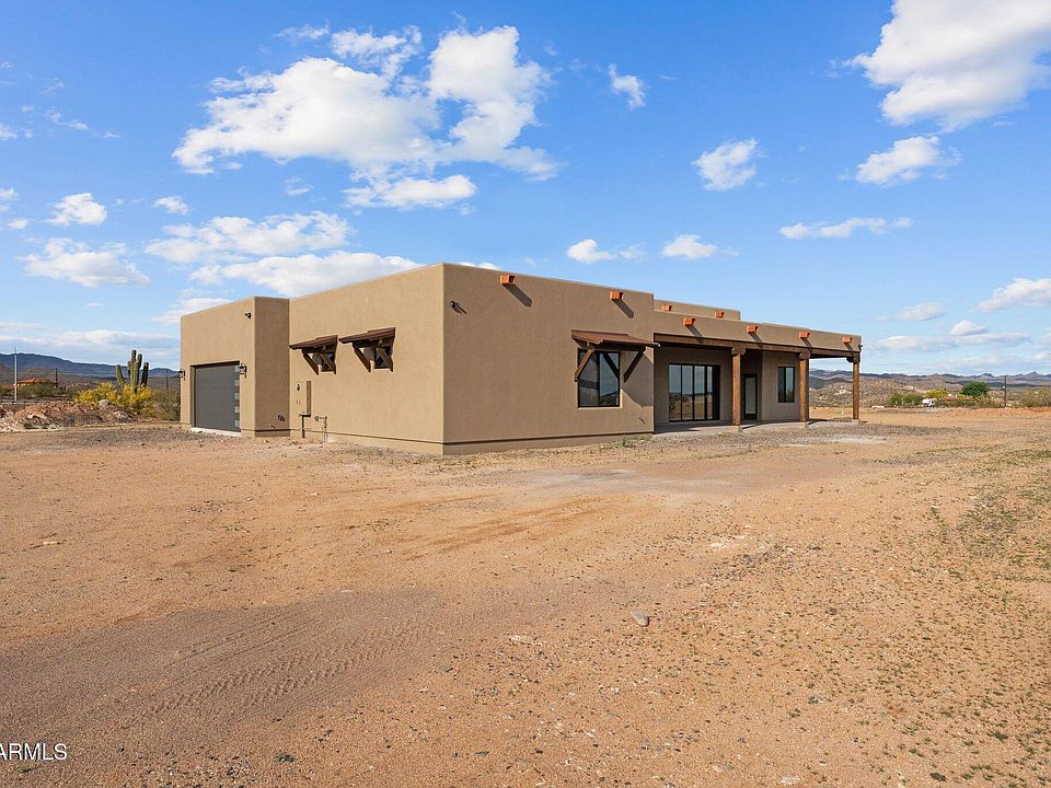 ROPING ARENA 140 X 240 PLUS 4 HORSE PENS TO BE BUILT ONCE UNDER CONTRACT, 2025 CUSTOM HOME, BEAUTIFUL 2610 SQ FT (4352 SQ FT UNDER ROOF) HOME ON 3.4 ACRES CLEAR THE LAND TO THE NORTH AND HAVE PLENTY OF ROOM FOR A SHOP, HORSE PENS, ETC KNOTTY ALDER CABINETS & DOORS, TRAVERTINE FLOORS THROUGH OUT, 10 & 12FT CEILINGS, FRONT YARD TO BE LANDSCAPED, STAINED EXPOSED CONCRETE ON FRONT & BACK PATIO, MASTER HAS HIS & HERS WALK-IN CLOSET, GUEST ROOM WALK-IN CLOSETS, DOUBLE SINKS IN BOTH BATHROOMS, UTILITY SINK IN GARAGE, PRIVATE OFFICE, GRAVELED ROAD TO PROPERTY, PRIVACY FENCE ON THE SOUTHEAST CORNER, VIEWS,OF VULTURE PEAK, MINUTES FROM SAEWAY, RANCHO RIO & DOWNTOWN,