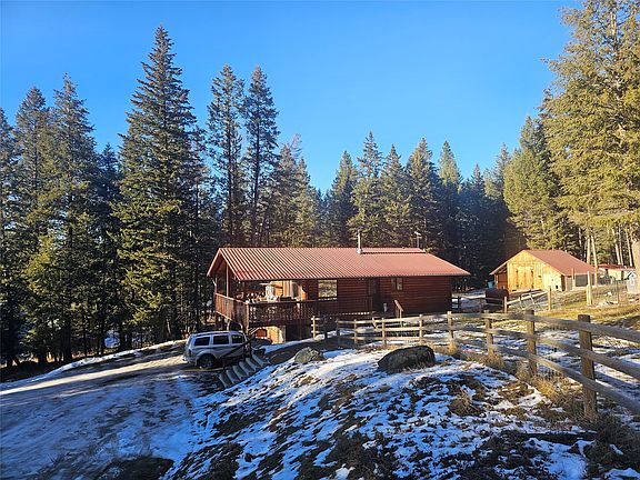 Set on just over six wooded acres near the entrance to Coon Hollow Road, this well-maintained log-sided chalet offers privacy, character, and classic Montana appeal. The property is bordered by approximately 200 feet of seasonal Bales Creek, with mature trees and mountain views creating a peaceful, natural setting. A private, scenic area near the creek offers an excellent potential homesite for a second residence nestled back in the woods. The land is cross-fenced and includes sheds suitable for animals or additional storage. The home features three bedrooms and two bathrooms, wood floors, and a cozy wood stove. A spacious covered deck provides an ideal place to relax and enjoy the surrounding forest. Outbuildings include a 30x40 garage/shop with 10’ overhead doors and a 12x16 storage building, offering excellent space for vehicles, equipment, or hobbies. Shared well. A great opportunity for those seeking space, privacy, and a true Montana lifestyle.