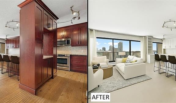 Top floorSweeping skyline viewsMassive balconyRich cherry wood built-insOpen-concept layoutOversized primary suiteExtensive custom built-ins