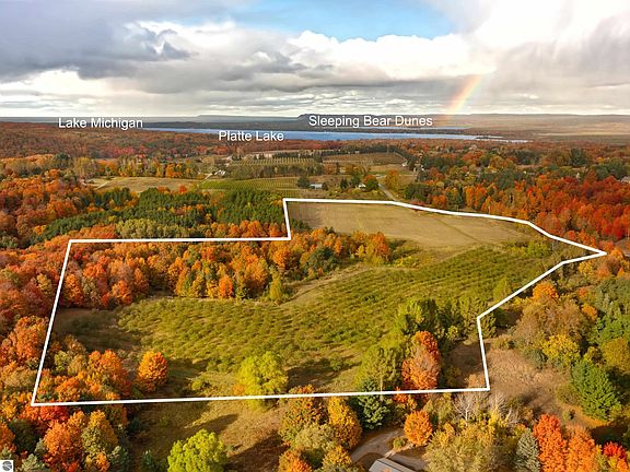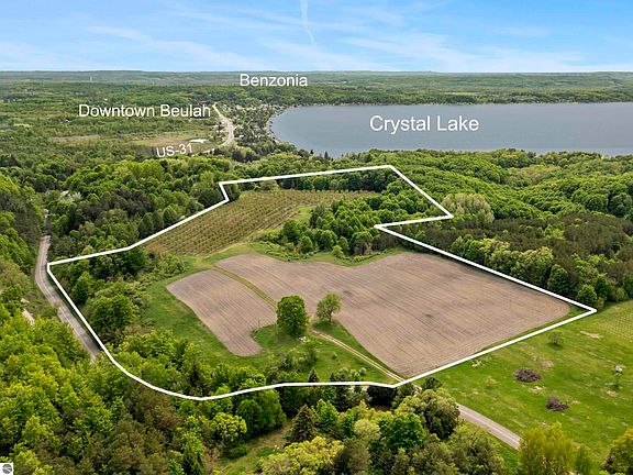 Rare chance to own 27 acres of pristine land in the enchanting hills surrounding Crystal Lake in Northern Michigan! Level areas, ready to build with a mix of hardwoods and tart cherry trees, this exceptional 27-acre parcel features stunning rolling terrain that perfectly balances privacy and convenience, with easy access to both the town and the lake. Well and electric already installed on property, build multiple homes, develop a planned unit community (PUD), continue cherry farming or create your own private estate in this idyllic setting, the opportunities are endless! Nestled between Crystal and Big Platte Lake, this property boasts a breathtaking ridge, offering panoramic sunset views. Zoning designated as R.P. 2.5, allows the flexibility for a minimum of 2.5 acres per lot or the potential for a PUD. This is a rare opportunity to invest in a prime location that combines serene living with exceptional accessibility. Available splits will transfer with the property.