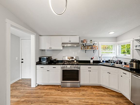 Welcome to this charming newly remodeled 3 bedroom, 2 bathroom home! Step inside to find luxury wood laminate floors stretching throughout the entire interior. The living room is a true centerpiece, featuring a stunning rocked wood-burning fireplace that adds warmth and character to the space. The kitchen is equipped with sleek stainless steel appliances and updated countertops. Whether you're entertaining guests or enjoying a quiet meal, the dining area provides ample space for any occasion. The primary bedroom is spacious and has a large bathroom featuring a double sink vanity. This home is available to lease for a 12 month period.