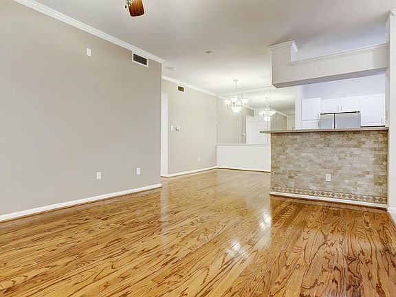 Spacious 2 bedroom, 1 bathroom condo featuring an oversized one car garage. This second-floor unit boasts hardwood flooring in the living and dining areas, neutral paint, and courtyard and pool views. Kitchen is outfitted with stainless steel appliances and tumbled marble backsplash. Breakfast bar is accented with stone tile. Sizable primary bedroom with a massive walk-in closet complete with custom closet system. Bathroom features double sinks and a large soaking tub. The detached one car garage has both an overhead and pedestrian door. City Plaza is a gated condo community within walking distance to NRG Park, TMC Smithland parking and numerous area attractions. Also conveniently located to downtown and medical center with easy access to I-610, Hwy 288, Metro bus lines and light rail. Community amenities include 24-hour manned gate, clubhouse, gym, swimming pool, car washing station, and outdoor grill areas.