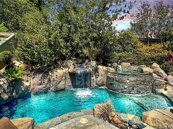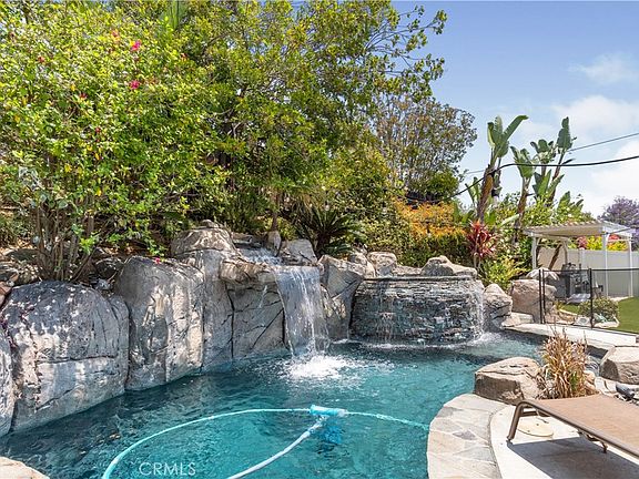The exterior of this home is just as impressive as the interior. Relax and unwind in your private backyard oasis featuring a sparkling pool with rock surround and waterfall, an inviting spa, and a covered patio with outdoor lighting for outdoor dining and entertaining.