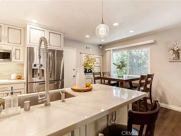 Step into the heart of the home—the beautifully remodeled kitchen, a chef's dream equipped with high-end appliances and smart design. The kitchen features a magic corner (tricked-out lazy Susan), drawer pullouts, sleek quartz countertops, a Samsung oven, Bosch dishwasher, Viking range hood, country sink, and a Jenn-Air espresso machine. The glass tile backsplash and under-cabinet lighting add a touch of elegance, while the spacious cabinetry and soft-close drawers provide ample storage and convenience.