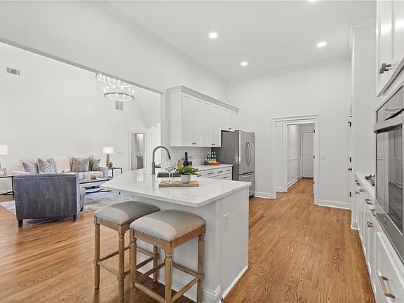 Newly resurfaced stone fireplaceSplit bedroom planCrisp white wallsNew cabinet doorsNew backsplashBeautifully renovated ranchQuartz counters