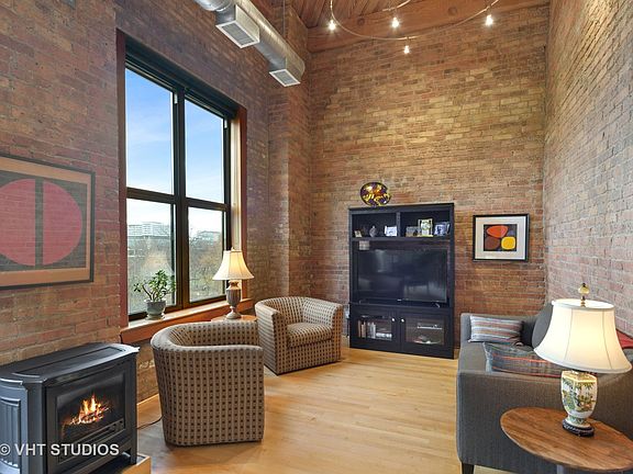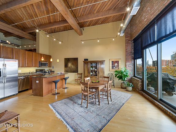 Southwest corner, top floor timber loft featuring 15' exposed timber ceilings and columns. Massive amounts of brick shape this unit on the south and west walls, floor to ceiling. This split floor plan bedroom and bathroom home features open kitchen with center island, all wood cabinetry, bullnose granite counters, stainless steel appliances, separate living and dining areas in 27' x 15' great room. South facing balcony with front row view of Skinner Park and Downtown. Roller shades throughout. Master suite with walk-in closet, bathroom with dual vanity and oversized shower with glass doors, recessed medicine cabinet. Second bedroom with beautiful built in , library ladder, under cabinet lighting and wine fridge. Halogen lighting. Formal entry. Bright maple, real "tongue and groove" hardwood floors. Walk to dog park, Skinner School and Park, restaurants on Madison, Washington, Randolph and Fulton Market. One garage parking space is included in the list price. Penthouse loft not often offered on one level at Block Y which also includes a private courtyard for residents, coi pond and waterfall.