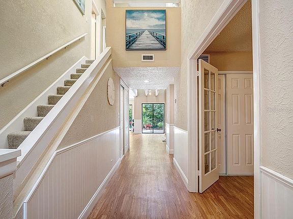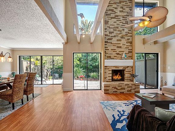 WOW! Spacious Remodeled Residence w/ TWO MASTER BEDROOMS (one upstairs/one on main level). This lovely 3 Bed**3 Bath Randolph Farms Townhome is RESORT STYLE LIVING & perfect for entertaining with wood-look laminate floors, high ceilings, and spacious private patios in front and back! The impressive Formal Living Room CATHEDRAL CEILINGS with WOOD BEAMS creating a feeling that will take your breath away! Then there's the IMPRESSIVE floor-to-ceiling ** custom-tiled FIREPLACE - wood burning - with sliding glass doors on both sides, leading to the private outdoor patio ** Remodeled Kitchen...white wood cabinets ** trendy butcher block counter tops ** sleek slate GE appliance package ** desk/office area in kitchen. SPACIOUS Dining Room with SOOTHING VIEWS of the landscaped, private, lush backyard through glass sliding doors. SPACIOUS Master Ensuite upstairs...cathedral ceilings, closets galore, and Master Bath featuring a glass shower door with walk in shower. Oversized Windows allow an abundance of natural light in! The downstairs Master Bedroom has French Doors, a wet bar/seating area and enough room for another office, with windows overlooking the front private courtyard! Come see it to believe it! Washer/Dryer Closet hookup inside the home (NOT in the garage). Many quality upgrades & finishes - see FEATURES & UPGRADES SHEET...2013 Roof, 2018 HVAC 2 A/C zones, freshly painted inside and out - 2020, CROWN MOLDING, NEW flooring, BASEBOARDS, and new carpet upstairs (2020). Nicely landscaped private pavered courtyard...high privacy wall. Private patio to the oversized 2 car garage with attic. Located in the meticulously maintained WATERFRONT community of Randolph Farms. Amenities include Waterfront Club House with SPECTACULAR INTRACOASTAL VIEWS ON THIS 25 ACRE EXPANSIVE, YET PRIVATE ESTATE OF 100 HOMES, Waterfront Pool, 2 Tennis Courts, Pickle Ball, Ping Pong, Fitness Room, Community Dock. Rented Boat Slips are subject to availability. PET FRIENDLY! Close to Shopping, Dining, Banking, Medical Facilities, & Gulf Beaches. St. Pete Clw Airport is 20 min drive and Tampa Int'l is 35 min drive. This townhome offers great value at $180/htd sq ft. Never miss a sunset on the water again. Don't forget to check out the interactive 3-D tour!