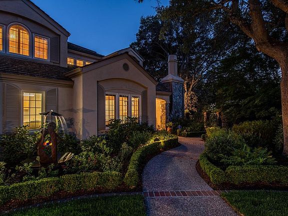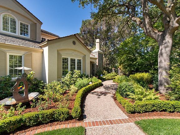 From the moment of arrival at the end of a cul-de-sac, this home exudes an ambiance of inspired beauty. Mature trees & lush foliage shelter the home from the street & a gently curved walkway leads to an impressive portico. Inside, a grand entrance introduces the home, which boasts ultra-luxe style & sophisticated design. Impeccable details include numerous fireplaces, crown moldings, plantation shutters, & architectural ceilings. The 3-story floor plan comprises formal venues, an office, tremendous kitchen & family room combination, plus a retro 1950s-style party room w/soda shop counter complete with stools plus adjoining wine cellar. There are 4 bedrooms, each with en suite bath, plus there are 2 half-baths & a detached guest house w/full bath. Outside, the grounds are destined for entertaining w/a pool & spa, sanded volleyball court, & walkways winding past Zen gardens & level lawn. House is ~6,226 sqft. & Guest House is 559 sqft. totaling 6,785 sqft. Excellent Palo Alto schools.