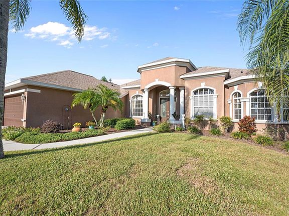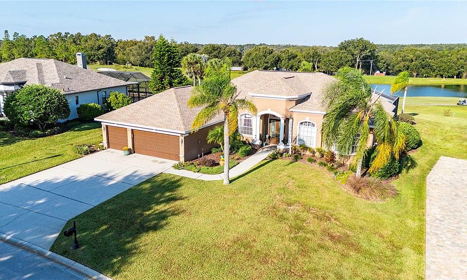 ** ENJOY THE BEST SUNSET VIEWS IN LAKE JOVITA** Discover refined elegance in this stunning 4-bedroom, 3-bath home boasting 2,741 square feet of sophisticated living space. Nestled on an oversized lot within the prestigious Lake Jovita Golf & Country Club, this Arthur Rutenberg–designed residence showcases the perfect blend of style, comfort, and timeless craftsmanship. Step inside to find gleaming hardwood floors, soaring ceilings, and abundant natural light that highlights the home’s elegant open layout. The split floor plan ensures privacy, while the gourmet kitchen delights with stainless steel appliances, solid-surface countertops, double ovens, ample cabinetry, and both formal dining and eat-in kitchen spaces—perfect for both everyday living and entertaining. The primary suite is a luxurious retreat, featuring dual walk-in closets and a spacious primary bath complete with dual sinks, a soaking tub, and a walk-in shower. Designed for relaxation and comfort, this suite offers a peaceful escape with tranquil views of the backyard oasis. Additional features include a dedicated office with French doors and two private guest wings, providing exceptional versatility for family and guests alike. Enjoy unforgettable sunsets and panoramic pond views—among the best in Lake Jovita—from your expansive screened lanai or while relaxing in your private pool. Residents enjoy low HOA fees, no CDD, and optional access to world-class amenities including championship golf, tennis courts, fitness center, community pool, and on-site dining. All of this is situated within a secure, gated community, just minutes from Wesley Chapel’s premier shopping, dining, and entertainment, and a short drive to downtown Tampa. The owner's favorite feature of the home is the openness of the home and the sunset pond views. Don’t miss your chance to own this Lake Jovita gem—schedule your private showing today!