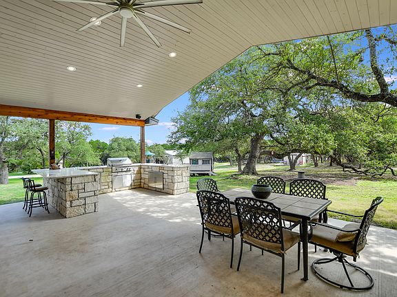Fantastic ranch style home, "retreat-like", stained concrete floors throughout, 10' ceilings, vaulted ceiling in family room, kitchen open to family room. Private setting surrounded by hundreds of oak trees. Neighborhood Description This community is made up of (50) homesites, each being 5-acres. All through streets are cul-de-sacs. There is one entry into this rural subdivision. Homes range in sizes from 2000sf to over 5000sf. Some homeowners have horse facilities on their properties. The topography is varied, from flat areas to sweeping hill country views.