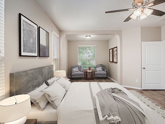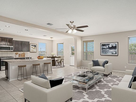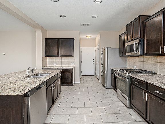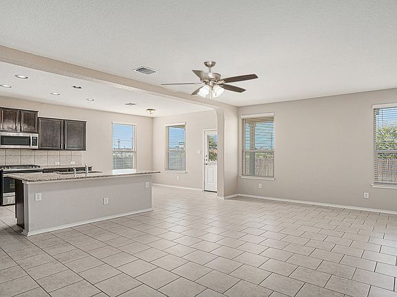This five-bedroom home features a primary bedroom conveniently located on the main level, complete with a cozy sitting area. The open living space is enhanced by dark brown cabinetry paired with light granite countertops, creating a warm and inviting atmosphere. The kitchen is equipped with a gas stove, stainless steel appliances, and an included refrigerator, all centered around a large island with a breakfast bar. Adjacent to the kitchen, you'll find a spacious pantry and a laundry room for added convenience. Upstairs, four additional bedrooms, along with a generous loft area that can serve as a game room, office, or second living space. Nestled on a larger pie-shaped lot, this property offers privacy with no neighbors behind, making it a perfect retreat. Remuda Ranch is conveniently situated just outside Loop 1604, approximately 20 miles from Lackland Air Force Base. Residents enjoy quick access to Alamo Ranch Shopping, Sea World, Fiesta Texas, and a variety of dining options. Nestled in Bexar County near Helotes, this vibrant community is served by the highly regarded Northside Independent School District. At Remuda Ranch, you can unwind in a neighborhood featuring a pool, a cabana, and a playground for children. Additionally, the nearby Government Canyon State Natural Area offers numerous opportunities for outdoor activities, making it an ideal escape from the hustle and bustle of city life.