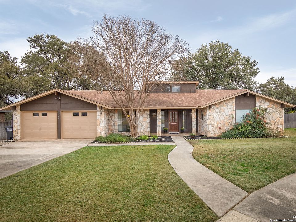 Charming mid-century Gem! Here is a chance to own a split 4/2 late 70's single story home. Nestled in a quiet cul-de-sac, this property lies within the heart of San Antonio in Blossom Hills. Located near the airport, Hwy 281, Loop 410, and 1604 parks, shopping malls, & in the NEISD School District. Recent improvements include fresh paint all through the home and backyard deck. Trimming of the live oaks are ready for the spring. Entering an oversized living space with a wrap-around stone gas fireplace and matching stone pillars. No carpet in the home. Laminate flooring and tile all throughout. Cook with ease using the double oven preparing meals amongst the granite countertops. The spacious primary bedroom features his-and-hers closets and double doors leading to a recently painted, large, shaded deck under the pergola. Storage shed out back is spacious. All bedrooms include oversized closets. Ample parking within a peaceful neighborhood makes perfect this one-of-a-kind home! No HOA! Come see this delightful home and make it yours today!