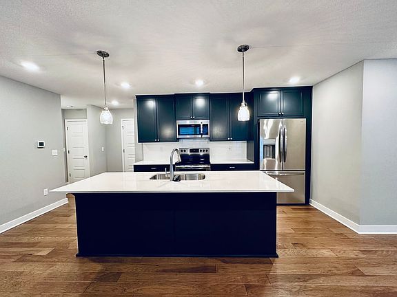 Nearly new 1.5 story construction in fantastic South Johnson County neighborhood! Open kitchen, living and dining room layout with modern finishes throughout. Kitchen features large, quartz island and pendant lighting. Main floor primary bedroom with large walk-in closet and bathroom featuring double vanity. A half bathroom and laundry room complete main level.