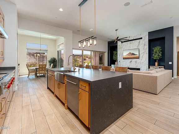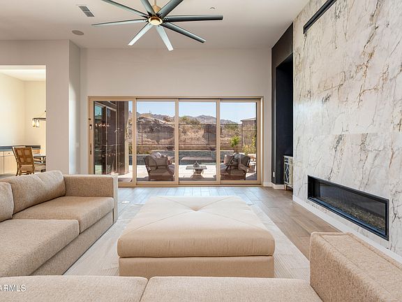 From the moment you arrive, a private courtyard framed between the main home and casita sets the tone for what's inside, an elegant retreat with a sense of openness leading to desert & mountain views. The heart of the home is an entertainer's dream kitchen, anchored by a striking island, ceiling-height backsplash, Wolf appliances, and custom cabinetry. Just beyond, a marble wall with linear fireplace Infusing luxury and character and capturing sweeping views including a stunning backyard pool w/solar heat The primary suite is a true sanctuary; spacious, light-filled, and complete with a spa-inspired en suite and oversized walk-in closet. Two additional bedrooms, each with walk-in closets and attached baths, offer comfort and privacy for family or guests. The private casita features expansive sliding glass doors, its own full bath and spacious walk-in closet, along with a thoughtfully designed kitchen and living room area for complete independence and comfort. A four-car garage provides ample space for vehicles, storage, or a workshop.
