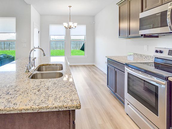 Welcome to this beautifully maintained home in the desirable Hunters Ridge community, featuring an open and split floor plan designed for modern living. Step into a spacious foyer offering convenient access to the garage, a walk-in closet, and an additional coat closet. To the right, you'll find two generously sized bedrooms and a full bathroom complete with granite countertops and stylish brushed bronze fixtures. The heart of the home opens to a bright and expansive living room with views of the backyard, seamlessly connected to a well-appointed kitchen. The kitchen boasts stainless steel appliances—including a built-in microwave, refrigerator, electric stove, dishwasher, and an undermount sink with disposal—along with a spacious walk-in pantry, large island, and a cozy dining area perfect for gatherings. The primary suite is tucked away for privacy and features large windows, a luxurious en-suite bath with dual granite vanities, a soaking tub, separate walk-in shower, and a sizable walk-in closet. Additional features include an automatic garage door, professionally landscaped yard, energy-efficient tankless gas water heater, and E tilt-in windows. The home is finished with upgraded luxury vinyl plank flooring throughout the main living areas and high-quality carpet in the bedrooms. Located just minutes from I-12, shopping, dining, and entertainment—and best of all, no flood insurance required! Don’t miss your chance to own this move-in-ready gem. Schedule your private showing today!