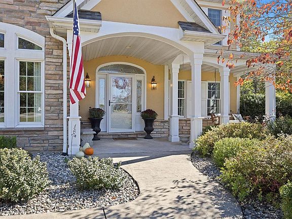 Stunning custom built 2 story on 3.53 acres offers upscale amenities and a welcoming atmosphere! From the front porch swing to the 2 story entry foyer and open staircase, you know you are going to be impressed. Featuring 5 bedrooms, 3.5 baths, oversized 3 car garage, main floor laundry, composite deck, LL patio and firepit in fenced backyard, this home checks a lot of must have items. Great room with fireplace and 18ft high ceiling, includes a bay wall of windows to view the meadow and woods w/ trails in back. Dream kitchen has heated porcelain tile flooring, quartz countertops, backsplash, center island, pantry and opens to a breakfast nook and a door leading to the composite deck. Split staircase to upper level, Primary suite w/ sitting area, coffered ceiling, 2 walk in closets and private bathroom w/heated floors. 3 additional bedrooms (one used as a dressing room) on this floor, Br 3&4 have an adjoining bath between them. Zoned HVAC, Walkout basement w/ 9 ft pour & fireplace.