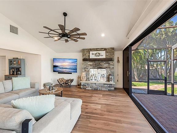 Breathtaking Riverfront Masterpiece with Ultimate Outdoor Oasis Imagine living in a stunning riverfront estate that’s been lovingly updated and upgraded! This home is designed for both entertaining and comfort, featuring a grand, open-concept split plan with soaring cathedral ceilings and breathtaking water views. Inside, you’ll find a modern, top-tier kitchen and fully renovated bathrooms, all while enjoying safety and security with impact windows, doors, and hurricane shutters. The outdoor space is truly unmatched, with a large, screened-in lanai with beautiful pavers, perfect for enjoying the breeze. You’ll also have an outdoor Jacuzzi—complete with TV+hookup—and a central paver fire pit area in the lush yard. Boaters will be thrilled with the private dock that includes two boat lifts (one covered), and the property’s security is enhanced by a solar-powered keyless entry gate on the side of the home, which has more pavers for parking anything large. Plus, there’s a dedicated children’s playground in the backyard, completely fenced in with beautiful black iron fencing, which completes this perfect family retreat. “This home seamlessly blends comfort with luxury, creating a true retreat.” If you’re interested in the boat with the purchase of the home, this can be negotiated.