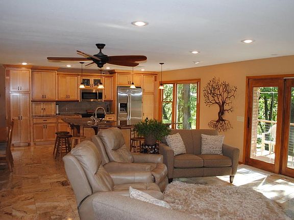 Spectacular views of Mississippi River boasting some of the best bass fishing. Meticulous built w/o rambler by master craftsman & nestled among woods & perennials. Private parkland w/ stone walkway. Professionally remodeled throughout w only the finest of materials. Travertine stone living/dining/kitchen. Granite counters, fine custom cabinetry, SS appliances. All living facilities main level inc laundry. Sep stairway garage to bsmt.