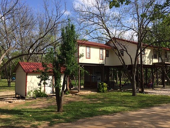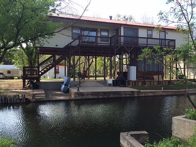 This Unique Home, sits on steel beams! Located at the end of the road, in a very private community. Over 180 ft. of creek side waterfront! Under the home you find the ultimate place to entertain and relax, 1246 sq feet of stained concrete with a outdoor kitchen, bar, bbq pit, and bathroom. The boat house has an electric lift on one side for your boat and Jet Ski lifts on the other. All around the area is perfect for fishing, SUP's, kayaks, and canoes. A short ride in the channel into Lake LBJ. The house is ready to move in, or just the perfect Get-A-Way! Two bedrooms and 2 full baths, large living room, kitchen with brunch area, and a utility room for washer and dryer. This home comes furnished and all appliances convey. 15 miles to downtown Burnet or a quick ride to Kingsland.