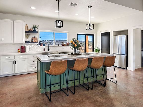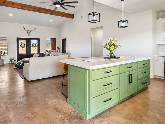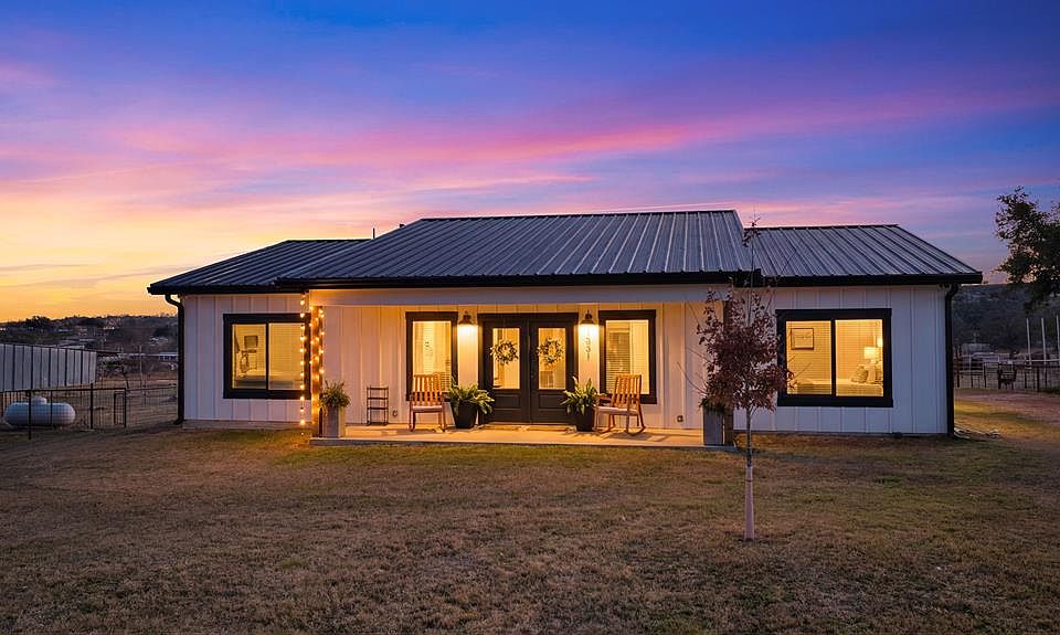 Positioned on nearly two acres just inside the Mason city limits along Koocksville Road, this thoughtfully crafted three-bedroom, two-bath residence offers a refined take on modern Hill Country living with room to breathe. Clean architectural lines, a metal roof, and a welcoming covered front porch set the tone, creating an inviting first impression that feels both timeless and intentional. Inside, the home opens to a light-filled living space defined by vaulted ceilings, polished concrete floors, and an open flow designed for everyday comfort and effortless entertaining. The living area transitions seamlessly into a well-appointed kitchen featuring crisp white cabinetry, a contrasting center island with seating, custom concrete countertops, stainless appliances, and statement pendant lighting. Large windows and glass doors frame views of the surrounding acreage, bringing the outdoors in and anchoring the home in its setting. The primary suite offers a quiet retreat with a calming palette and a spa-inspired ensuite bath complete with a dual vanity, modern fixtures, and a beautifully tiled walk-in shower. Secondary bedrooms are generously sized and thoughtfully finished, while the shared bath continues the home's cohesive design with quality materials and clean, contemporary styling. A dedicated laundry and mudroom adds everyday functionality with custom storage, custom stained wood countertops, durable finishes, and direct outdoor access—ideal for country living without sacrificing organization or ease. Outside, the property is equally compelling. A well-maintained lawn surrounds the home, while the fully fenced acreage behind it offers flexibility for show animals, hobby livestock, or future equestrian improvements. Paved road access, a covered parking area, and proximity to Mason's award-winning schools and conveniences make this property both practical and highly desirable. Well cared for and beautifully executed, this home offers a rare combination of modern design, usable acreage, and in-town convenience—an exceptional opportunity just minutes from the heart of Mason.