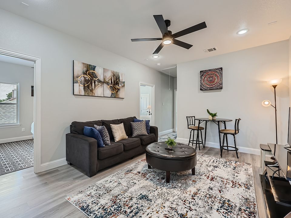 Spacious Living Area: Relax in our cozy living room, featuring plush seating, a large flat-screen TV, and plenty of natural light.
