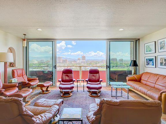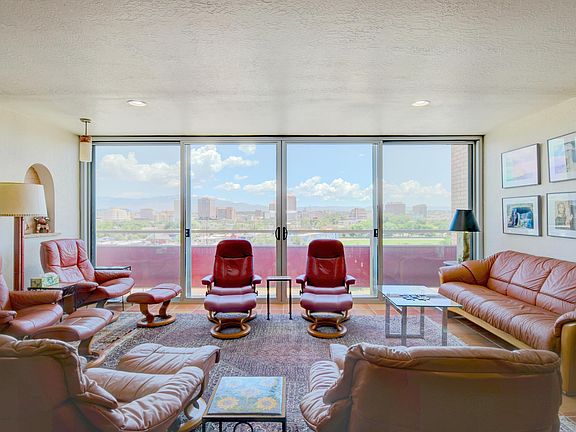 Beautiful furnished double unit with 2 bedroom,2 bath condo located on the 7th Floor. As you walk in, you'll be greeted to a beautiful entry way and spacious living/dining with maintenance free living in Albuquerque. Enjoy breathtaking views of the of the city and Sandia mountains via renovated Low-E wall of sliding doors. Flooring was renovated throughout with Saltillo Tile. Custom made bookshelves in the Foyer, family room and primary guest suite. The kitchen is a chef's delight with ample custom cabinets, granite breakfast bar island, walk-in pantry, SS appliances, microwave, dishwasher, refrigerator, and includes a Wine Bar and Wine Refrigerator. Two guest suites have renovated baths. HOA covers all utilities,
