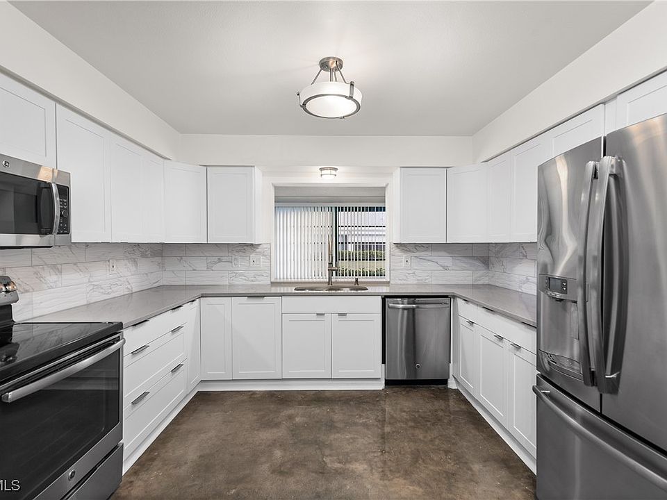 New roofBeautiful backsplashQuartz counter topsNewly remodeled kitchenStainless steel appliancesWhite cabinets