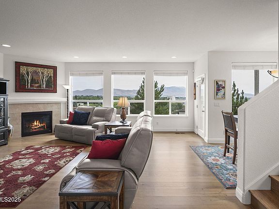 Amazing mountain and city views surround this beautiful west side Carson City townhome, with scenery enjoyed from nearly every room. The spacious great room features a cozy gas log fireplace and large windows that frame the views. The kitchen is designed for both function and style with granite countertops, ample cabinetry, and a seamless flow into the living space. Offering 3 bedrooms, 2.5 baths, plus a versatile bonus room, this home provides comfort and flexibility. Step outside to your private backyard patio where nothing but open mountain landscape lies beyond—a rare and serene setting. Thoughtful upgrades include hardwood flooring throughout, an ADT security system, resurfaced balconies with a durable rubberized finish, drip edge protection for the stucco siding, and an inlet isolation valve for convenient water shutoff. The garage is enhanced with new cabinets, slat walls, and even an additional refrigerator. Outdoor living is a breeze with a Sunsetter motorized awning with wind sensor and a swamp cooler for the patio, keeping summer days refreshing. A new paver pathway and stairs add easy access to the backyard, complemented by a fenced backyard with gate. This well-cared-for home offers exceptional views, modern updates, and low-maintenance living in a prime west side location. Furnishings are negotiable—contact agent for details. Move-in ready and waiting for its next owner!