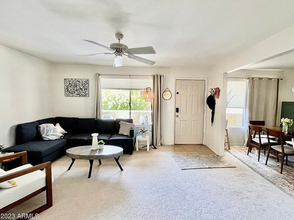 GREAT MID LEVEL CONDO LOCATED IN FOREVER POPULAR DOBSON RANCH! THIS MOVE-IN READY HOME FEATURES: OPEN LIVING AREA WITH PRIVATE FIREPLACE, MODERN DINING ROOM WITH ACCENT WALL, OPEN KITCHEN WHICH FEATURES NEWER STAINLESS STEEL APPLICANCES, REFRIGERATOR, RANGE & DISHWASHER INCLUDED & STAYS, MAPLE CABINETS WITH BLACK STEEL HARDWARE. 2 GOOD SIZE BEDROOMS, 2 FULL BATHROOMS WITH TUB/SHOWER COMBO IN BOTH BATHROOMS. PRIVATE MASTER PATIO. ADDITIONAL FEATURES: FRONT COVERED PRIVATE PATIO, POOL VIEW UNIT, UPGRADED BATHROOM FIXTURES, NEW CARPET 2022, NEW CURTAIN & CURTAIN RODS. NEW WATER HEATER 2022, NEW AC 2021-2022, NEW ROOF 2021, NEW CEILING FAN IN MASTER BEDROOM, FULL SIZE WASHER/DRYER IN UNIT. 1 ASSIGNED COVERED PARKING WITH STORAGE CLOSET. HOA INCLIUDES WATER & TRASH & ALL DOBSON RANCH AMENITIES