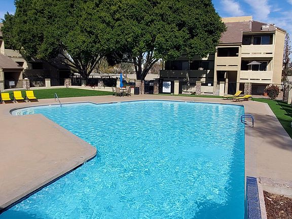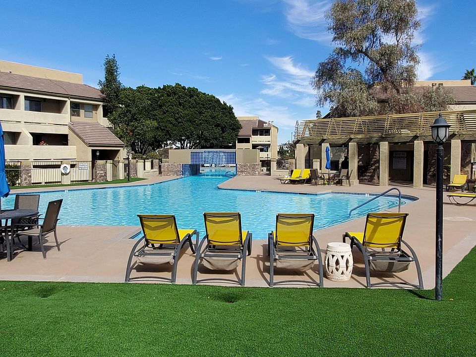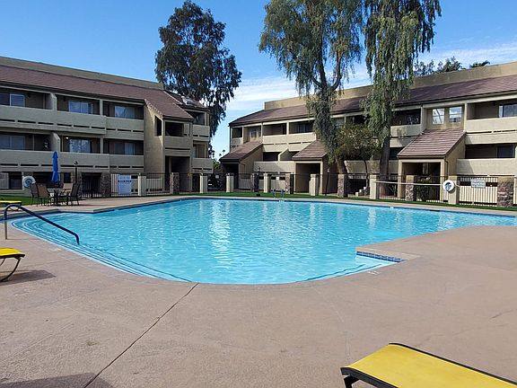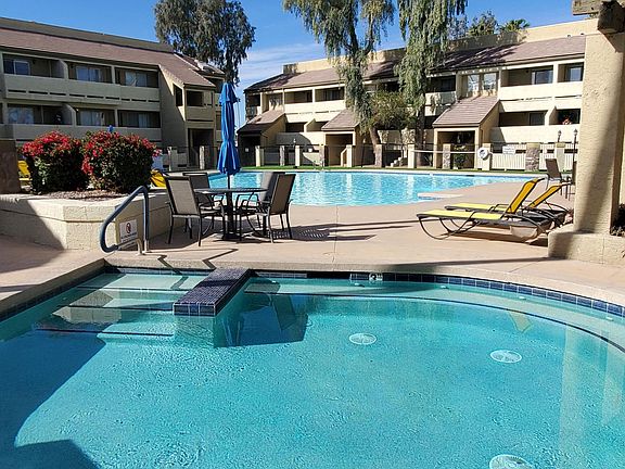 Highly desirable Dobson Bay Club - Resort Living Every Day! This 2 bed 2 bath end unit Condo is nicely situated within the community. With a courtyard facing view right off your front balcony you are only 100 ft away from the massive Pool and Spa. Enjoy easy access to all the amenities. Inside you'll find a nicely cared for functional floorplan with a cozy fireplace, wood laminate floors throughout, full size washer & dryer, separate breakfast area, a barstool seating area at the kitchen island and a balcony for the primary suite. Both bedrooms have access to separate bathrooms so it can function as two primary suites. As part of the Dobson Association, you will have access to recreational facilities including pickleball, tennis courts, and a lakefront park with boat docks at Dobson Ranch BONUS** This Condo comes with a dedicated secure Storage Area right in front of your covered parking space attached to the unit to store your Mountain bikes and more.