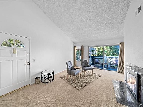 Welcome Home! Enjoy the open feeling of this upper unit with balcony and vaulted ceilings! Great top corner location for easy access to walk to shopping and restaurants, or hop in your car and go! Plenty of beautiful upgrades make it easy for you move right in - remodeled kitchen with newer stainless steel appliances (refrigerator included) and newer tile floors, marble fireplace surround, freshly painted throughout, newer carpeting.