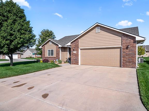 Zero-entry, patio home on the west side of Wichita in Crystal Gardens! All the things you love about zero-entry patio homes without the exorbitant price, plus special pay out next year! When you first enter this home, you can tell for yourself, this home has be meticulously maintained. The warm wood floors in the spacious entry welcome you into a fantastic great room with living, dining and kitchen all in one. Anchored by a large island, this kitchen will make any chef happy! New stove and dishwasher in 2023, granite transformations countertops and backsplash, walk-in pantry, plenty of cabinets, and under mount and above cabinet lighting for that special ambience with the flip of a switch. The dining space opens onto the covered patio, with beautiful green space to enjoy your coffee! The primary suite has a large bedroom with private bathroom boasting two sinks, walk-in shower and walk-in closet that serves as your storm shelter/safe room. Second bedroom is currently being used as an office and third bedroom is just down the hall from full second bath with updated, air-jet tub. The curb appeal is so charming: Fresh exterior paint, manicured flower beds, and mature trees on a large corner lot with no home directly behind you. Plus the HOA takes care of lawn maintenance, snow removal and trash service! Homes in this neighborhood don't come along very often, don't miss your chance on this one!