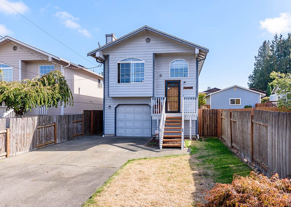 Move-in ready split level home! Updated kitchen with dark hardwood floors throughout the house. Open floor plan concept with vaulted ceiling with ample nature light. 2 bedroom upstairs and 1 bedroom downstairs with an additional rec room. Updated bathrooms and gas fireplace in the living room. Generous backyard with access from the rec room with garden shop in the fully fenced backyard. Easy access to H-509, downtown Seattle and Seatac Airport. Great price for this area!