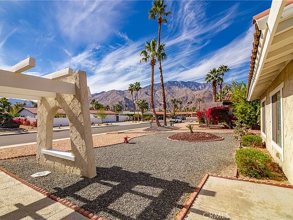 Cosmetic Fixer! Located on a cul-de-sac street in the north end of Palm Springs in the Victoria Park subdivision on private land. Unobstructed gorgeous views of the San Jacinto mountains, convenient to the famous aerial tramway. Sleekly designed with the sought after desert architecture and great curb appeal! The open floor plan interior features a vaulted ceiling step down living room w/custom brick fireplace & hearth, slider door exit to large covered patio & yard, adjacent family room/breakfast room w/wet bar, dine -in kitchen with serving bar, attached laundry room + washer & dryer & lg. pantry/utility cabinet, door to garage. Near the front entry is a formal dining room w/chandelier & down the hall is a large main bathroom with a tub/shower combo, two secondary bedrooms plus the large ensuite primary bedroom with vaulted ceiling, 2 separate mirrored closets, slider door to covered patio & yard, & an upgraded attached bathroom with toilet room & walk in shower. Other features include; central AC/heat, carpet throughout, Plantation shutters, ceiling fans for good air circulation, newer fresh paint, upgraded interior doors. The front yard has the easy care desert rock landscape with pleasing colors, shrubbery, 3 car garage cooled by window AC unit, concrete driveway & walkways, tile roof. The private & expansive backyard also has low maintenance rock landscaping w/garden beds & shubbery plus a large covered entertainer’s patio. Great location in the community.