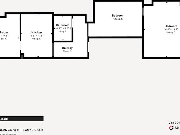The kitchen, while compact, features modern amenities including wooden cabinetry, a tiled backsplash, and essential appliances. Large windows in various rooms flood the space with natural light, enhancing the sense of openness. The primary bedroom, measuring 190 sq. ft., provides a comfortable retreat.