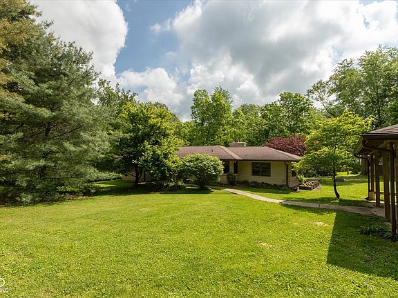 Discover this exceptional mid-century limestone ranch on nearly 3 private, wooded acres in one of Bloomington's most sought-after eastside neighborhoods. Enjoy peaceful country living just minutes from the College Mall, IU Hospital, downtown amenities, and only one block from University Elementary School. This home feels like a private retreat, surrounded by mature pine trees, a wooded landscape, and a babbling landscaped water feature that gives the feel of your own nature preserve. Birdie powder-coated garden beds, fenced garden area, and multiple outdoor living spaces create a serene, resort-like setting free of city restrictions. Step out the back French doors onto a custom Trex deck overlooking a Redbud tree and forest-perfect for morning coffee or evening gatherings. Inside, warm neutral tones and original oak hardwood floors flow through the living room and three bedrooms. Large windows invite natural light and peaceful views, while the cozy stone hearth with a porcelain wood-burning insert adds charm and warmth. The kitchen features a window-lined breakfast nook, updated countertops, stainless steel appliances, a large double sink, and an oil-rubbed bronze Moen faucet. The primary bath includes a carved double vanity, Tuscan ceramic tile, and matching bronze fixtures. Thoughtful updates throughout maintain the home's mid-century character while adding modern comfort-energy-efficient windows with custom blinds, Amish-built carport, mini barn, roof, gutters, sidewalks, Trex decking, and a rebuilt chimney. Appraised at $450,000, this home provides instant equity for the next owner. Seller is open to selling furnished. This quiet, upscale neighborhood is known for its spacious, beautifully landscaped lots and well-maintained homes that offer both privacy and community.