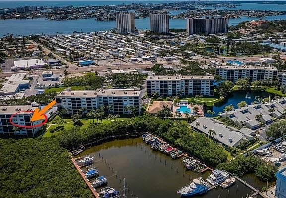 RARE 5th-floor CORNER UNIT with stunning water views in every direction — the kind of opportunity that doesn’t come along often in the highly sought-after gated community of Pasadena Cove. With wide panoramas of the marina, Boca Ciega Bay, and even Gulf of Mexico glimpses from the front walkway, this spacious 2-bedroom, 2-bath layout offers unmatched natural light and endless potential. Inside, the home is ready for a full renovation, making it the perfect blank canvas for a buyer who wants to design their dream coastal retreat. Corner units rarely become available — especially those positioned this high — and this one delivers water views from every window, a split-bedroom layout, and a private screened balcony where you can enjoy shimmering sunrises over the bay. Pasadena Cove is a resort-style, pet-friendly, non-age-restricted waterfront community known for its peaceful atmosphere, lush landscaping, and excellent amenities. Residents enjoy a heated pool & spa, renovated clubhouse with full kitchen and billiards, modern fitness center, shuffleboard courts, walking paths, and a scenic boardwalk to a private marina that offers boat slips for purchase or rent (when available) through the HOA — giving boaters direct access to Boca Ciega Bay and the Gulf. Additional conveniences include in-unit laundry, a same-floor storage locker, a secure bicycle room, and deeded covered parking directly in front of the building. Milestone inspection and SIRS have been completed with no current special assessments, providing peace of mind for future owners. Perfectly located just minutes from St. Pete Beach, Treasure Island, Gulfport, shopping, dining, medical centers, and the SunRunner transit line, this unit delivers the best of Florida coastal living — with the rare chance to transform an upper-floor corner residence into something truly extraordinary. Bring your vision, your creativity, and your contractor — the potential here is unlimited. Schedule your private showing today and imagine the possibilities!