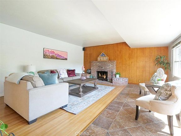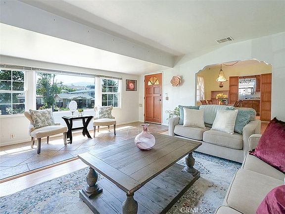 A stunning ranch-style home surrounded by a field of flowers in the heart of San Pedro's highly desirable Vista del Oro neighborhood is waiting for you! This brick-adorned home features an inviting front porch and is perched above a sunny tree-lined street bursting with flowers. Through the spacious front room's picture window, enjoy breathtaking views of the hills of Rancho Palos Verdes. Inside, charming details abound, including built-ins throughout and an original archway that adds so much character to the space between the front room and dining room. Don't forget the cozy brick fireplace! Through the doorway you will find a beautifully remodeled kitchen featuring built-in dining seating and table complete with USB charger ports. The kitchen is adorned with thick, beautifully cut granite countertops on all sides, while solid wood cabinetry with stylish hardware enhances the elegance of the space. Here you can also find recessed lighting, easy-care ceramic tile flooring, a convenient trash drawer, and matching shelves at the end of cabinets for more storage. Every detail has been meticulously considered to enhance functionality and style. Just off the kitchen, there is an enclosed laundry area with shelving and lighting, providing easy access while keeping everything neatly out of sight. Adjacent to the kitchen is den with matching tile flooring, leading to the sliding glass door that opens out to a covered aggregate back patio. The backyard is lushly landscaped with mature plants including roses, plumeria, and a tangelo tree. The property includes a detached one-car garage that has a built-in workbench for various projects. A long driveway, lined with vinyl fencing, offers parking space for two cars, or room for a boat or trailer. Hardwood floors grace most of the home extending seamlessly to all three bedrooms. The main hall bath features a jacuzzi tub for luxurious relaxation. Windows have been upgraded to dual-pan for enhanced energy efficiency. Home is equipped with central heating and air, reverse osmosis, and tankless water heater for modern comfort and convenience. Plumbing and electrical systems have been updated, and the foundation has been earthquake retrofitted for added safety and stability. You'll discover beaches, parks, shopping, restaurants, an aquarium and more all located nearby. You'll enjoy convenient transportation options, with access to buses, the Vincent Thomas Bridge, and the 110 freeway nearby.