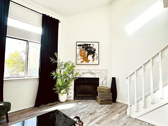 floor huge primary suite with large closet door flows to updated 3/4 bath.Full of light living room has vaulted ceiling with skylights and cozy wood fireplace with marble surround. The unit comes complete with a dual washer/dryer. Functional kitchen is updated with NEW kitchen cabinets, countertops and a SS refrigerator. Upstairs features an open loft with spacious walk in closet and full bath, perfect for home office or bedroom. Attached garage is downstairs in the lower level with private secured storage room. Plenty of quest parking near the house. Great community with tons of amenities that include large indoor pool, tennis courts, parks and walking trails close by. Seller gives $1000 credit for some windows.