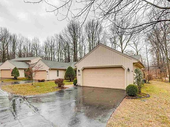 A beautiful 3-bedroom, 2-bath home with views of the creek in Timberlake Condominiums. The home offers a welcoming front porch drawing you into the foyer with tiled floors. The moment you walk thru the front door you are greeted by a soaring beamed cathedral ceiling and skylights in the great room, which offers a fireplace and glass doors leading to the sunroom overlooking the property, the trickling creek, and decorative wooden foot-bridge over the creek. The eat-in kitchen boasts an abundance of storage space and a lovely view of the tree-lined property through the large bay window. The mature trees scattered about the property are visible from nearly every room in the home, including the master suite, which features a full bath with walk-in shower and spacious linen closet. The second bedroom is just off the entry, and offers direct access to the second full bath. There is a third bedroom, near the master, that completes the floor plan. The garage has many great features including peg board, a work desk, and plenty of room for storage. This home is a must see!