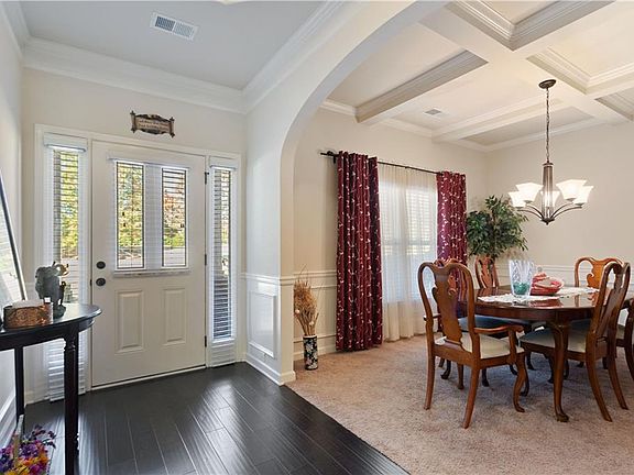 Welcome to this stunning 4-bedroom, 3-bath home featuring a beautifully landscaped lawn and a desireable location directly across the street from the community swimming pool and tennis courts. This spacious, well-maintained property offers an inviting combination of main-level living and flexible upstairs space, perfect for families of all sizes. Step inside to find a grand entryway with a high tray ceiling, engineered hardwood flooring throughout the kitchen, entrance hallway, and keeping room, and a coffered ceiling in the separate dining roon. The open-concept floor plan seamlessly connects the eat-in kitchen, keeping room, and breakfast area - perfect for both everyday living and entertaining. The kitchen is a chef's dream, featuring a center island, granite countertops, stained cabinets, walk-in pantry, counterdepth breakfast bar, and black appliances (refrigerator not included). The adjoining keeping room and breakfast nook overlook the backyard and back patio, offering the perfect spot for coffee or grilling. Refrigerator does not remain.