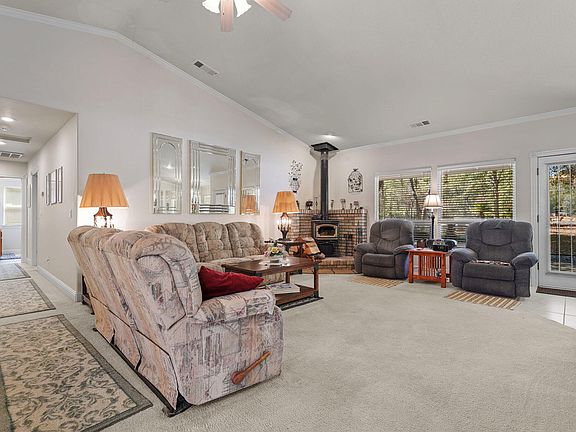 Welcome to your own private park retreat! This spacious and well-maintained 2,144 sq ft home is situated on 2.95 beautifully landscaped acres. Inside, you'll find a warm and inviting living area complete with a cozy woodstove—perfect for chilly evenings. The home offers both a formal dining room and a casual dining area just off the kitchen, providing flexible options for everyday living and entertaining. With 3 comfortable bedrooms plus a dedicated office, there's plenty of space for family, guests, or working from home. Step outside to enjoy a lovely front seating area and a peaceful back patio—ideal spots to relax and watch the local wildlife. The backyard features attractive pea gravel and pavers for low-maintenance enjoyment, while the front yard has a lush lawn. Mature trees provide shade over benches and picnic tables, creating a tranquil, park-like atmosphere. For parking and storage, you'll appreciate the two attached two-car garages, as well as dedicated side parking for an RV.