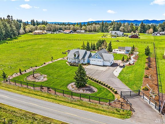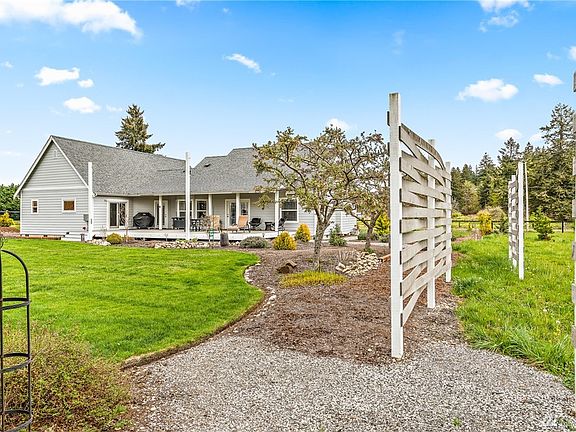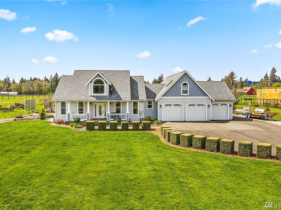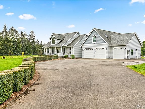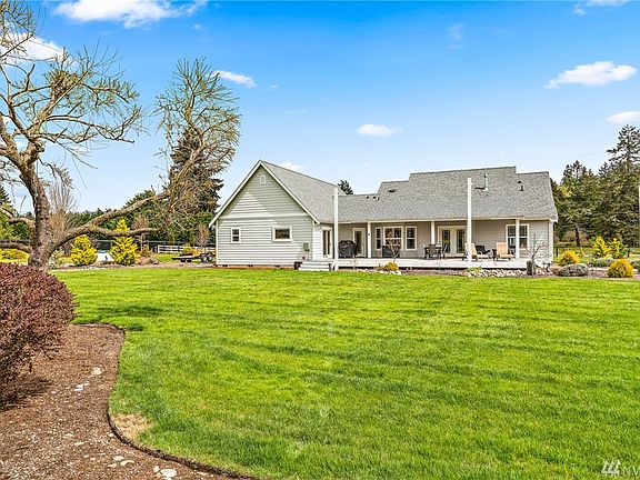 This is it! Fully fenced 5 acres with main floor master. 3 brm, 2.5 bath home w/ bonus room above the garage. Entertain on your large trex deck that can be shaded in the summer! There's even a heat pump for those warm days. Large 3 car garage, large home like outbuilding, and firepit. Home is wired for automatic start generator. Level, flat land landscaped with native plants and heritage fruit trees. There's even room for a barn or shop. Close to I5 & amenities.
