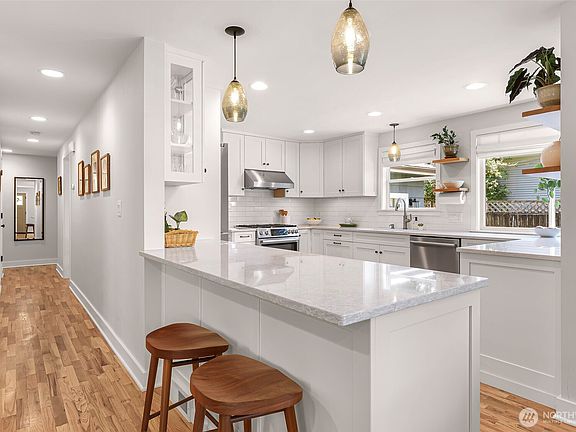 This beautifully, FULLY updated rambler in Olympic Hills welcomes you w/ a flowering courtyard. Inside hardwood floors lead to a bright living room w/ a cozy gas fireplace. The open-concept kitchen boasts ample quartz counters, Newport Brass faucet, & Bosch appliances- a chef's delight. The 3 beds center around the remodeled main bath w/ a subway tile shower & heated towel rack. The ensuite primary bedroom lives large w/bath & walk-in closet. A multifunctional laundry room & spacious bonus room w/ vaulted ceilings flows onto to the deck. The expansive backyard includes a shed, raised garden beds, and a patio. New furnace, electrical + panel, plumbing, AC, - too much to list! Truly Move-in ready & impeccably maintained w/ ample parking!