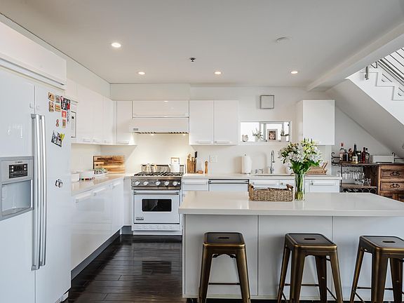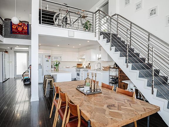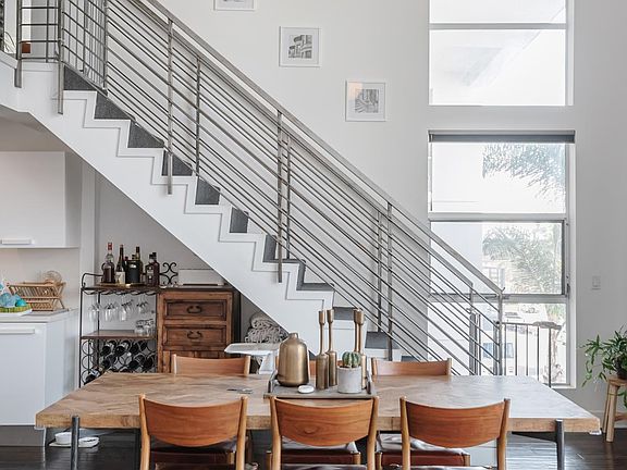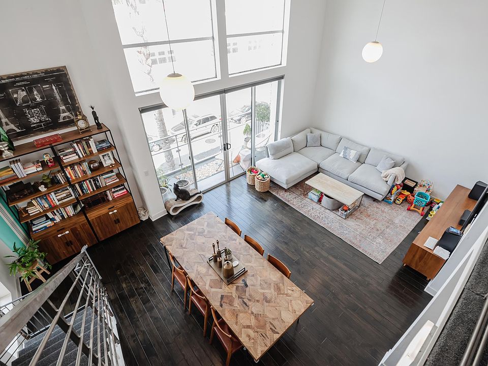 Modern architectural loft nestled in the Marina Arts district, complete with stunning features throughout! Enter in the foyer and notice the abundance of natural light that filters through the beautiful north facing, floor to ceiling windows. This two level open concept space has massive ceilings, modern finishes and separate spaces for sleep, work and play. Beautiful dark hardwood floors provide contrast to the crisp white finishes and chrome touches. Entertain in a well appointed chef's kitchen with contemporary counters, cabinetry and appliances. Upstairs you will find a primary retreat and bathroom on the same level for convenience. Enjoy outdoor space on a well situated living room balcony that overlooks the street. The home offers either two bedroom spaces or a primary and den/office space plus 2 full bathrooms. Sought after location near everything Marina del Rey has to offer. Close by restaurants, shops, freeways, the beach, Abbot Kinney and so much more!