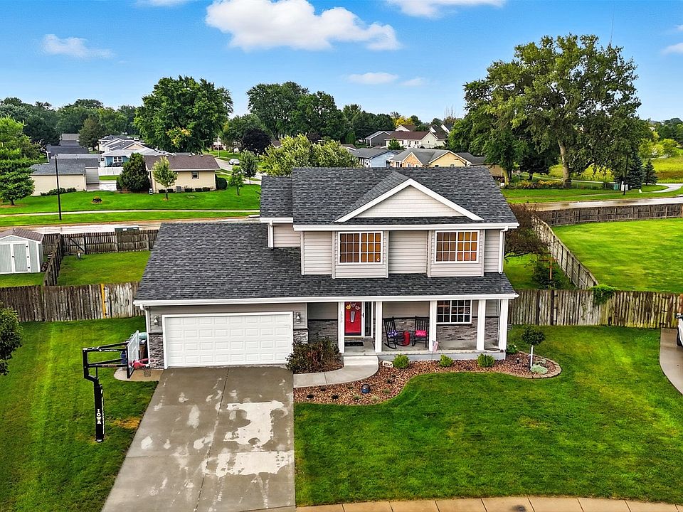 This beautifully maintained 2 story home is tucked in one of the area's most desirable neighborhoods, offering scenic ponds, walking trails, and quick access to the aquatic center, skate park, and library. A charming front porch sets the tone before stepping inside to a versatile great room, perfect for a home office or formal dining space. The open layout flows effortlessly into the inviting living room with a cozy gas fireplace, then to the dining area ideal for gatherings, and into a bright kitchen with breakfast bar, stainless steel appliances, and generous cabinet storage. A first-floor laundry and half bath add convenience. Upstairs, find 3 spacious bedrooms with large closets, including a primary suite with walk-in closet and private bath. The finished basement expands your living space with a comfortable family room, non-conforming bedroom, and half bath, ideal for guests, hobbies, or a playroom. The privacy-fenced backyard is a nice size in town lot made for entertaining with a 16x21 deck and a firepit area for evenings under the stars. A 2-car attached garage completes this move-in-ready home, cared for with pride inside and out.