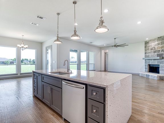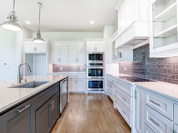 Experience refined living in this exceptional ALTUM custom home, where expert craftsmanship and contemporary elegance converge. From the striking black-framed windows to the grand 9-foot iron and frosted glass entry door, every element has been meticulously curated to make a stunning first impression. Inside, a thoughtfully designed 5 bedroom, 4 bath open-concept layout welcomes you with hand-stained hardwood floors and a sleek fireplace that serves as a centerpiece for the spacious living area. Expansive picture windows invite an abundance of natural light, creating a warm and inviting ambiance throughout. The gourmet kitchen is a culinary showpiece, perfectly suited for both everyday living and upscale entertaining. It boasts a waterfall-edge granite island, two-tone custom cabinetry with glass-front displays, a built-in spice rack, and top-tier stainless steel appliances. A generous walk-in pantry nearby ensures ample storage for every occasion. The primary suite is a serene retreat featuring a spa-inspired ensuite bath with a frameless glass walk-in shower, freestanding soaking tub, dual vanities, and an oversized walk-in closet with custom storage and direct access to the laundry room for added convenience. A private study with a walk-in closet provides a flexible space for a home office or personal library, while the secondary bedrooms each include en-suite or adjacent baths and walk-in closets, offering both comfort and privacy. Built with enduring quality in mind, this home includes foundational piers and energy-efficient spray foam insulation. Outdoors, enjoy year-round relaxation on the covered patio, perfect for dining and entertaining al fresco. An irrigation system maintains a lush, vibrant lawn with ease. This residence is a true testament to timeless luxury, thoughtful design, and superior construction—crafted to elevate modern living.