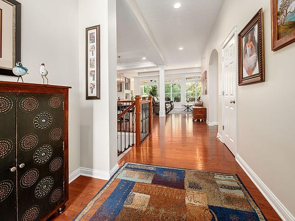 Stunning open floor plan with a wall of windows overlooking a private treed conservation zone directly behind the house. 3/4'' hardwoods throughout the main living area. The kitchen includes granite, a new stainless refrigerator, newer dishwasher and gas stove. A laundry room with cabinets and utility sink is right off the kitchen. Directly next to the kitchen is the dining area with an expansive view of the great room and wall of windows beyond. Beside the kitchen in the back is the family room offering an access door to the deck/patio, a gas fireplace perfect for cooler evenings, and a beverage refrigerator/wine cooler cabinet. The kitchen hallway leads to 2 of the bedrooms and a full bath. Tucked away privately on the other side of the house is the spacious primary suite. An office/den is located at the front of the side hallway which also includes a half bath, the garage entrance, and 1 of 2 hallway closets. Over $50,000 recently spent on landscaping, rear patio, stairs, and front walkway. A covered rear porch with ceiling fans offers a place to enjoy the private yard. Newer paver patio includes a gas line for a grill, and a gas line to the fire table (conveys). Full basement with plumbing for future bath. Sprinkler system front and back. A very nice home!