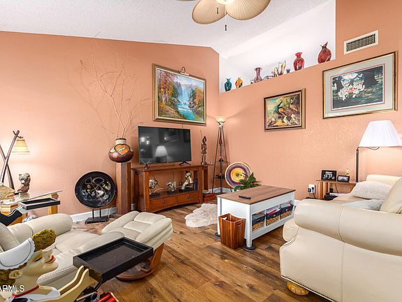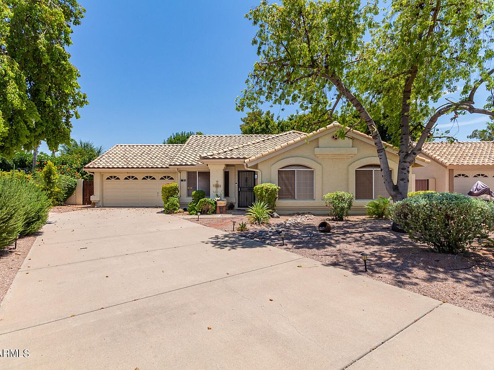 Welcome to this inviting residence on a peaceful cul-de-sac! The home is centrally located near the freeway, shopping, and more. The home's exterior features an extended driveway and a 2-car garage for ample & secure parking. Venture into the living room with vaulted ceilings, a neutral palette, elegant custom window blinds, & attractive wood-look flooring. The eat-in kitchen offers wood cabinetry with crown molding, chic pendant lighting, a pantry, and discover a cozy den ideal for an office or study. The serene main bedroom includes an ensuite with dual sinks, low profile shower & a walk-in closet. Unwind after a long day in the backyard, boasting a covered patio, fruit trees, mature shade trees, also owned solar.Don't miss out on this fantastic opportunity! Highly Motivated seller!